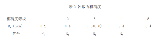 沖裁面的粗糙度用算術(shù)平均值aR 表示。其值一般Ra=0.2~3.6,共分為六個等級(見表2),