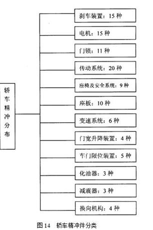 精沖工藝技術(shù)的發(fā)展,使其進(jìn)入了各個工業(yè)領(lǐng)域,得到廣泛的應(yīng)用。對于要求最小尺寸公差、具有最小粗糙度的功能零件,可以廣泛使用精沖零件。而對于有視覺要求的、很精細(xì)的表面零件,也可使用精沖零件?,F(xiàn)今,精沖件的生產(chǎn)品種、尺寸形狀、材料厚度和力學(xué)性能都有很大的提高。而且為了適應(yīng)市場需求,生產(chǎn)的均衡性、質(zhì)量可靠性和加工經(jīng)濟(jì)性更加突出。汽車工業(yè)是精沖技術(shù)推廣應(yīng)用的重中之重,一輛轎車精沖零件擁有量為40~200件,它占轎車沖壓件的60~70%,如下圖所示: